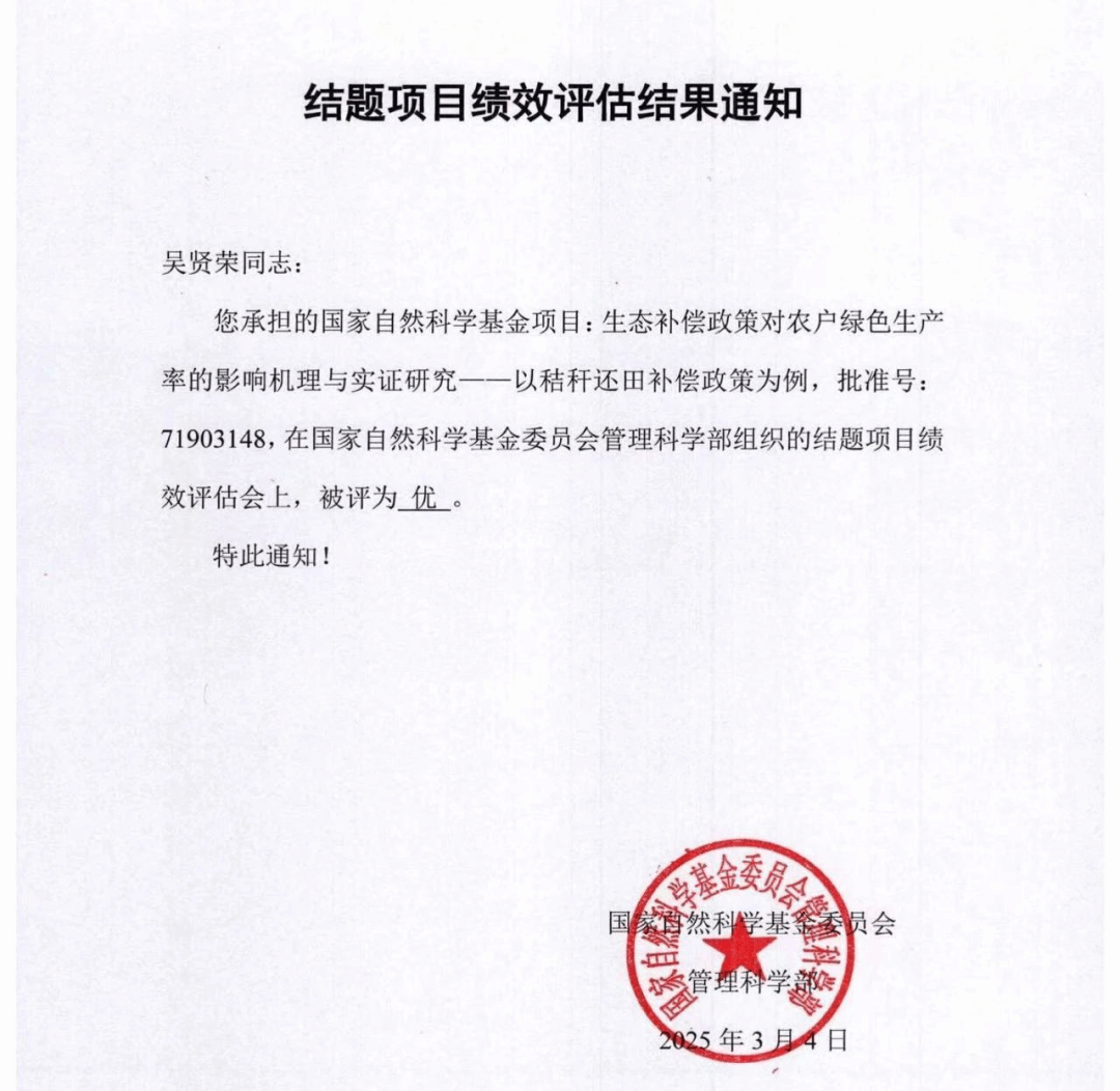 近日,国家自然科学基金委员会管理科学部组织开展了国家自然科学基金项目结题绩效评估。华中农业大学农业绿色低碳发展实验室特聘研究员、武汉工程大学法商学院校聘教授吴贤荣主持的《生态补偿政策对农户绿色生产率的影响机理与实证研究——以秸秆还田补偿政策为例》课题,在本次评估中获评“优秀”等级。