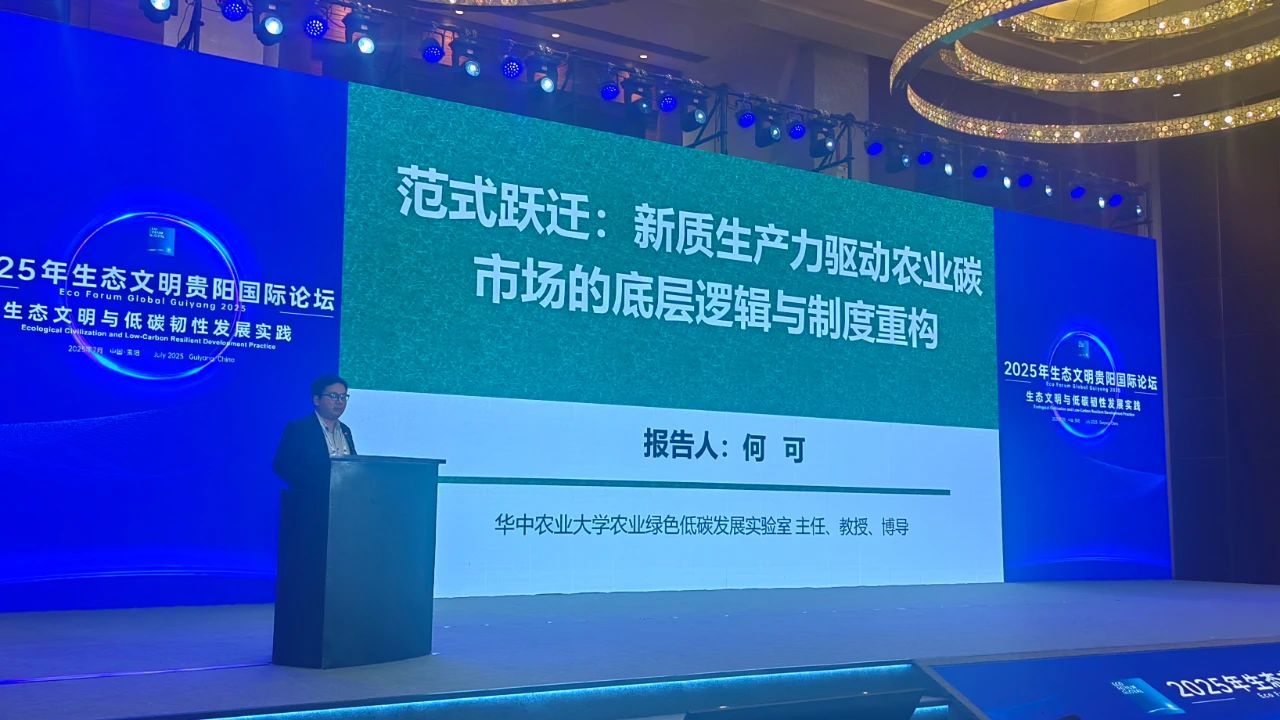 华中农业大学农业绿色低碳发展实验室主任何可教授应邀在“生态文明与低碳韧性发展实践”主题论坛作题为《范式跃迁:新质生产力驱动农业碳市场的底层逻辑与制度重构》的报告,呼吁以新质生产力重构农业碳市场,破解工业范式与小农生态矛盾。