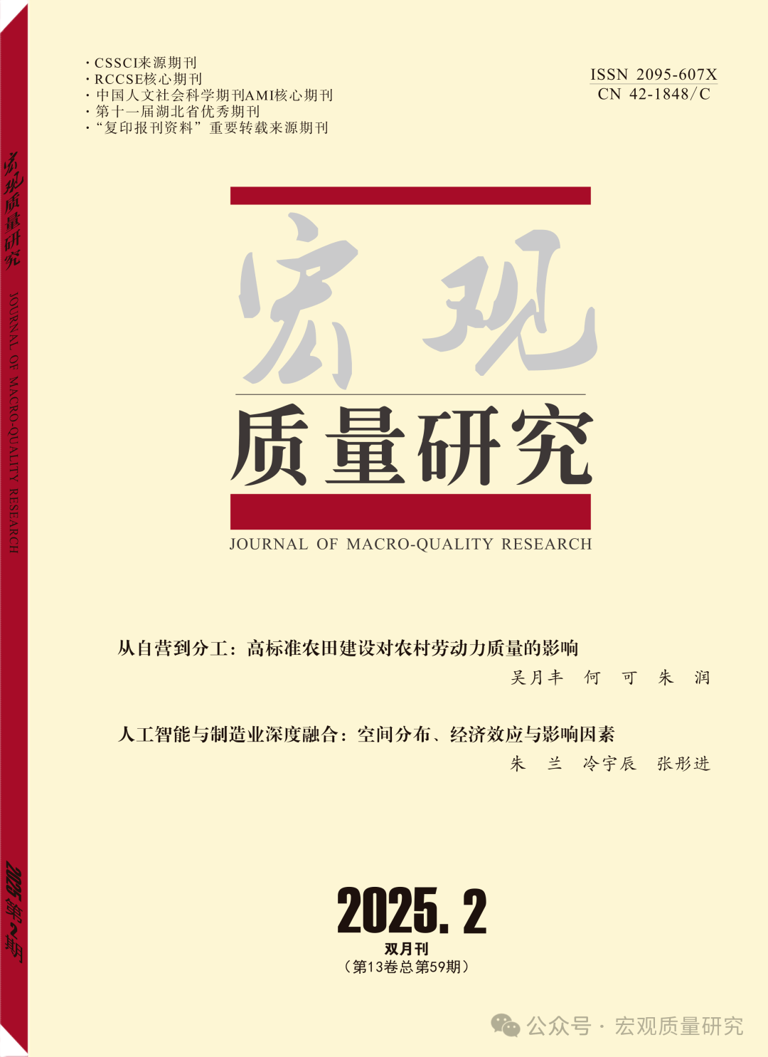 【核心提示】近日,华中农业大学农业绿色低碳发展实验室博士生吴月丰为第一作者、实验室主任何可教授为通讯作者的论文《从自营到分工:高标准农田建设对农村劳动力质量的影响》作为“封面文章”发表于《宏观质量研究》2025年第2期。