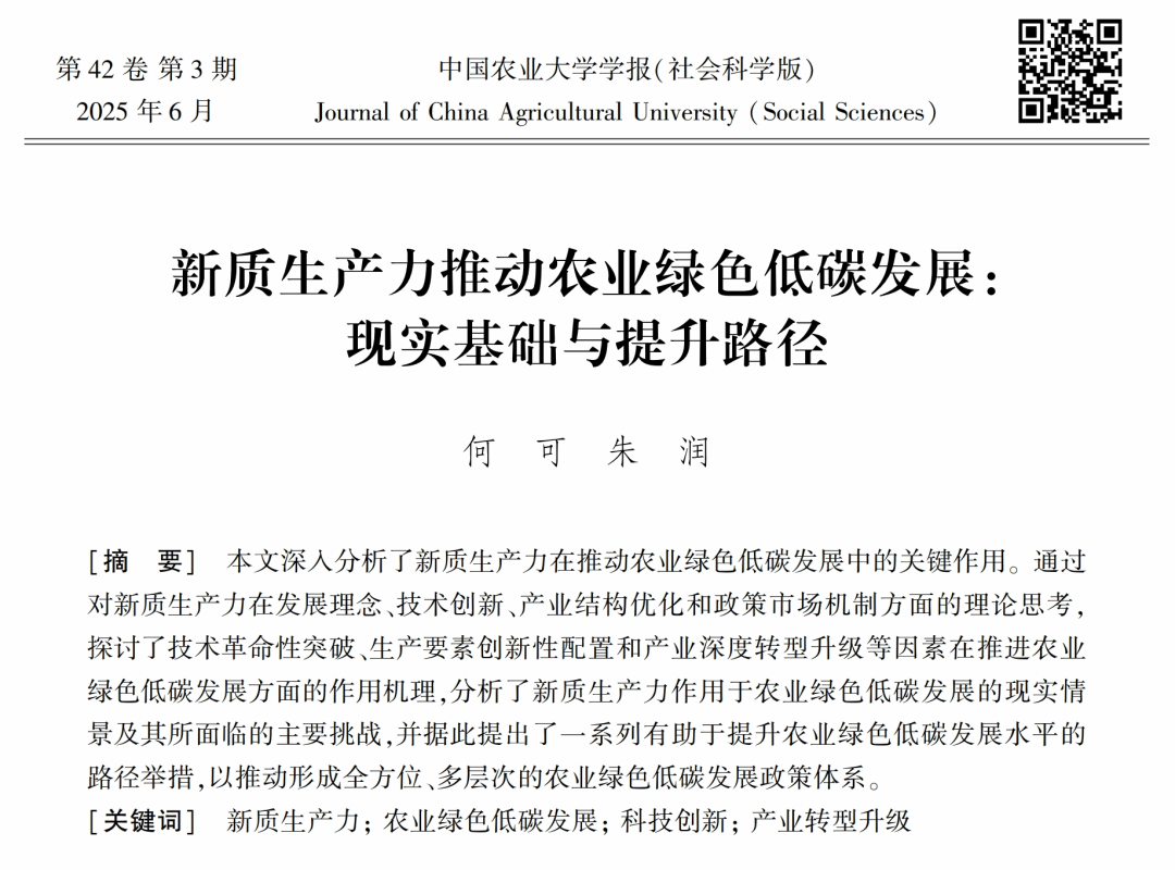 【核心提示】《中国农业大学学报(社会科学版)》特邀华中农业大学农业绿色低碳发展实验室,围绕“农业绿色发展”这一主题撰写了论文《新质生产力推动农业绿色低碳发展:现实基础与提升路径》(作者:何可、朱润)。该文发表于《中国农业大学学报(社会科学版)》2025年第3期。朱润为本文通信作者。
