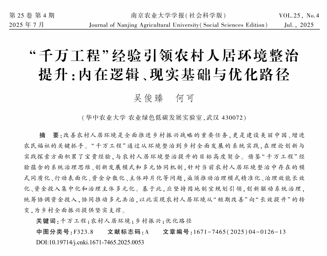 【核心提示】《南京农业大学学报(社会科学版)》特邀华中农业大学农业绿色低碳发展实验室,围绕“深化农村改革 推进乡村全面振兴”这一主题撰写了论文《“千万工程”经验引领农村人居环境整治提升:内在逻辑、现实基础与优化路径》(作者:吴俊臻、何可)。该文发表于《南京农业大学学报(社会科学版)》2025年第4期。何可为本文通讯作者。