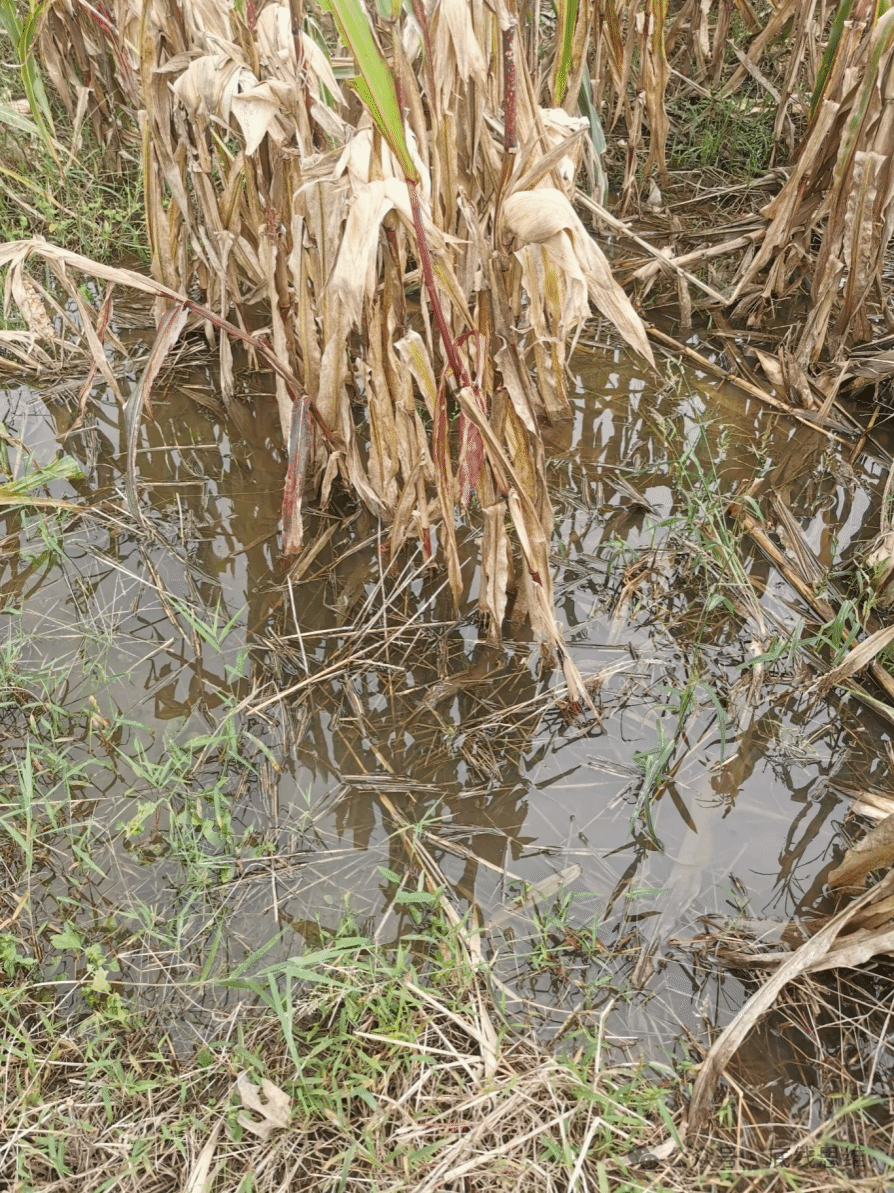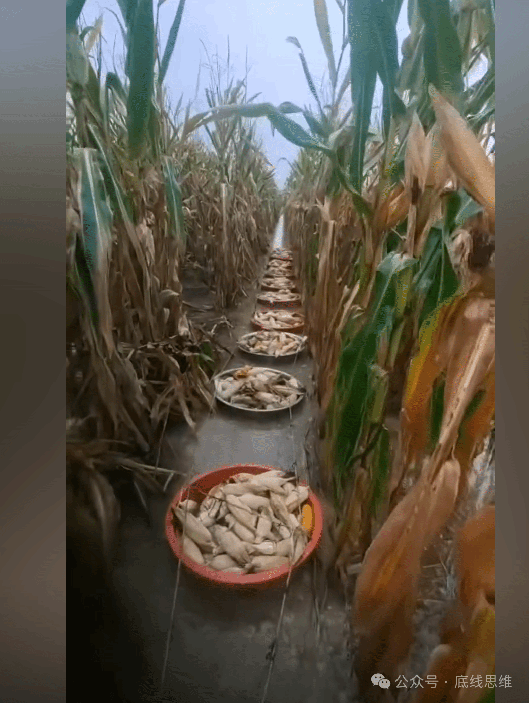 于是,习惯了旱作的北方农民,穿上连体雨衣和大长雨靴,趁着不下雨的日子,拿起锄头,穿上长袖长裤,带上草帽,早早地走进泥泞的土地里,依次完成摘玉米、砍玉米梗、运玉米、掰玉米、晒玉米、脱粒等一系列工作。有些雨势大的地方,甚至出现了一个吊诡的情景:直接在地里给玉米“坐上船”,用大盆一盆一盆地装玉米,然后漂流到“岸上”。